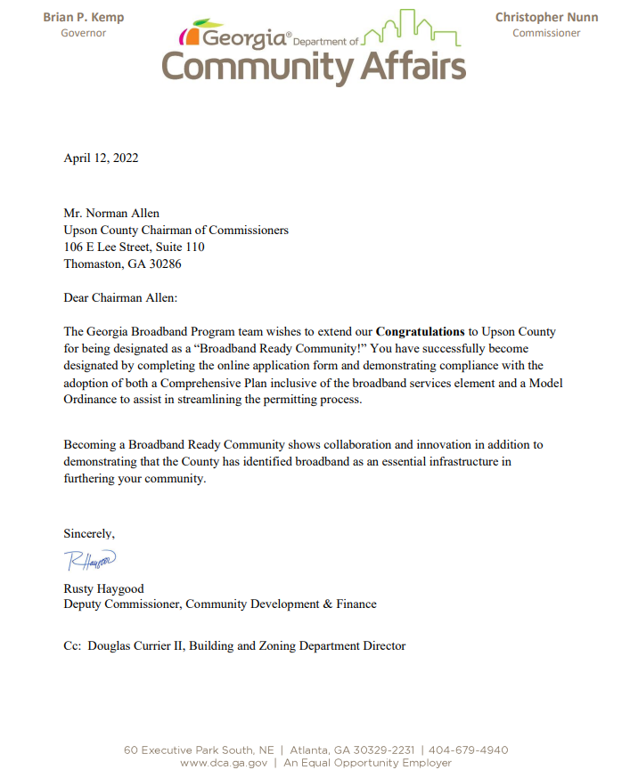 Click here to view the Upson County Broadband Ready Community Designation Letter